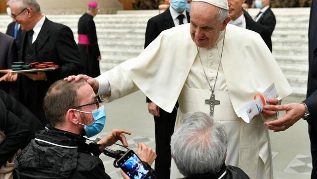 El Papa Francisco bendice a un peregrino que acude a la audiencia en silla de ruedas