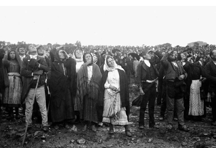 En seguida, un fenómeno en el cielo convenció a los presentes del milagro prometido pues el sol, pareciéndose a un «disco» de plata, se le podía mirar sin dificultad alguna y giraba sobre sí mismo como si fuese una rueda de fuego que fuera a precipitarse sobre la tierra.