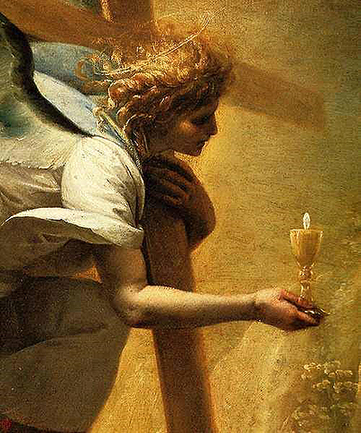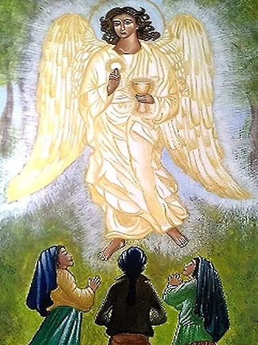 El ángel dejó suspendido el cáliz en el aire, se acercó a nosotros y nos hizo repetir tres veces: «Santísima Trinidad, Padre, Hijo y Espíritu Santo, yo te ofrezco el preciosísimo cuerpo, sangre, alma y divinidad de Jesucristo…». Luego se levantó, tomó en sus manos el cáliz y la hostia; me dio la hostia santa y el cáliz lo repartió entre Jacinta y Francisco… (ibíd., p. 48).
