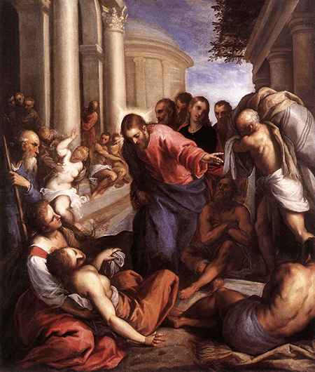 Era un día de fiesta para los judíos, cuando Jesús subió a Jerusalén. Hay en Jerusalén, junto a la puerta de las ovejas, una piscina llamada Betesdá, en hebreo, con cinco pórticos, bajo las cuales yacía una multitud de enfermos, ciegos, cojos y paralíticos, que esperaban la agitación del agua. Porque el ángel del Señor descendía de vez en cuando a la piscina, agitaba el agua y, el primero que entraba en la piscina, después de que el agua se agitaba, quedaba curado de cualquier enfermedad que tuviera.