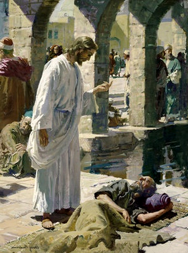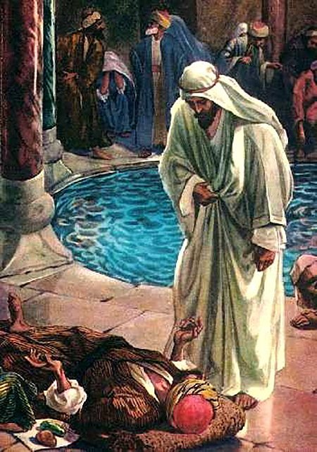 Jesús llega al lugar en medio del gentío y se detiene en la persona que más sufre a causa de su enfermedad: un hombre paralítico con una dolencia de 38 años que, a la vez, no recibía ayuda de nadie, pero que aguarda con cierta esperanza el momento de su curación, ya que permanecía siempre cerca de la piscina. La actitud de este hombre representa la perseverancia que debemos tener frente a nuestras peticiones; así como la paciencia en la lucha interior y la constancia en el apostolado.
