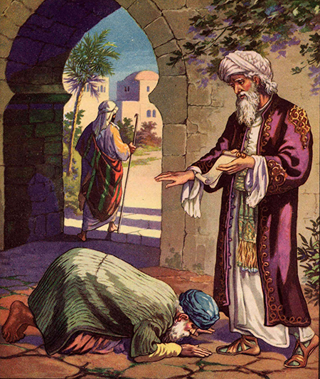 Pero, apenas había salido aquel servidor, se encontró con uno de sus compañeros, que le debía poco dinero. Entonces lo agarró por el cuello y casi lo estrangulaba, mientras le decía: ‘Págame lo que me debes’. El compañero se le arrodilló y le rogaba: ‘Ten paciencia conmigo y te lo pagaré todo’. Pero el otro no quiso escucharlo, sino que fue y lo metió en la cárcel hasta que le pagara la deuda.