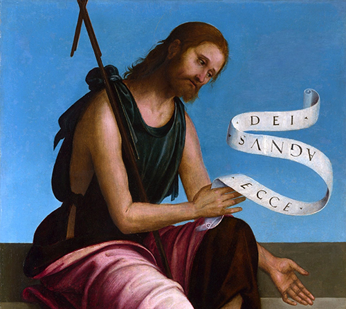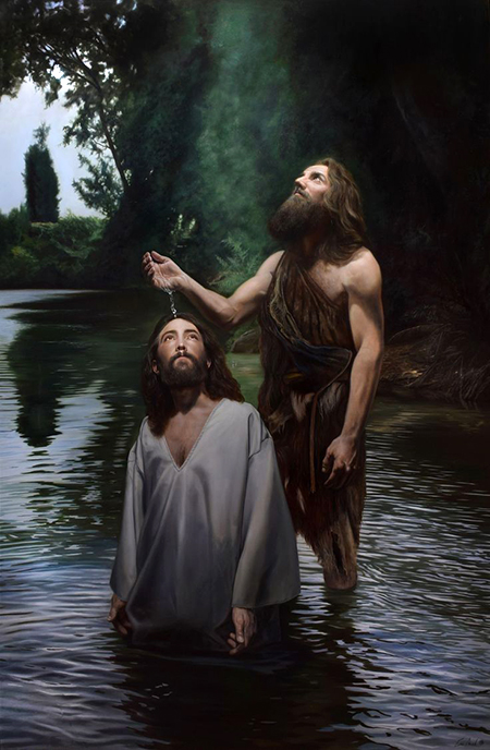 Los sinópticos dejan claro en sus relatos que Juan se reconoce inferior: rehúsa bautizar a Jesús (Mt 3,13-17), la voz del cielo revela la dignidad divina de Jesús (Mc 1,9-11), y el cuarto evangelio que no relata el bautismo señala que el Bautista da testimonio de haber visto posarse la paloma sobre Jesús (Jn 1,29-34) y de su propia inferioridad (Jn 3,28).