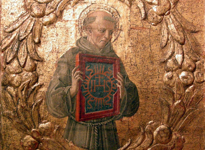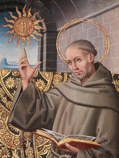 San Bernardino fue canonizado en 1450, es decir, a los seis años de su muerte, y había nacido en 1380 en Massa Marittima, de una noble familia de Siena. Como quedó huérfano de ambos padres, siendo todavía muy niño, lo criaron dos tías. Estudió en Siena hasta los 22 años, y después abandonó la vida mundana para vestir el hábito franciscano. Dentro de la Orden fue uno de los principales propulsores de la reforma de los franciscanos observantes. Difundió la devoción al santísimo nombre de Jesús, y en unas tablitas de madera hizo grabar el monograma “JHS” que le hacía besar al público al final de sus sermones.