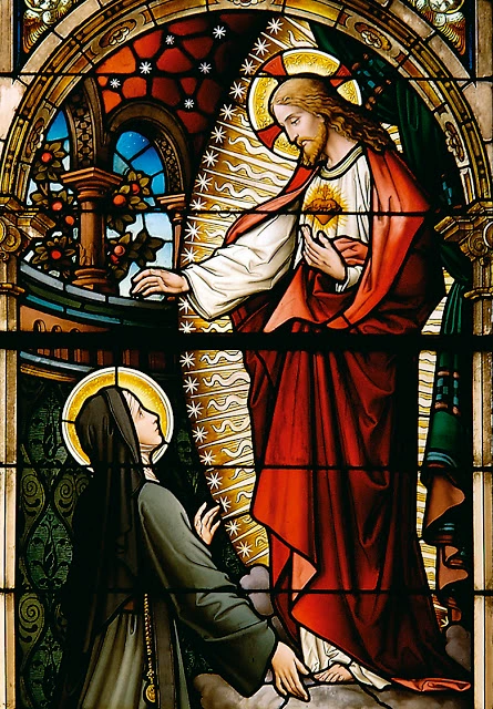 Santa Margarita María de Alacoque era una religiosa de la Orden de la Visitación. Tenía un gran amor por Jesús. Y Jesús tuvo un amor especial por ella. Se le apareció en varias ocasiones para decirle lo mucho que la amaba a ella y a todos los hombres y lo mucho que le dolía a su Corazón que los hombres se alejaran de Él por el pecado. Durante estas visitas a su alma, Jesús le pidió que nos enseñara a quererlo más, a tenerle devoción, a rezar y, sobre todo, a tener un buen comportamiento para que su Corazón no sufra más con nuestros pecados. El pecado nos aleja de Jesús y esto lo entristece porque Él quiere que todos lleguemos al Cielo con Él. Nosotros podemos demostrar nuestro amor al Sagrado Corazón de Jesús con nuestras obras: en esto precisamente consiste la devoción al Sagrado Corazón de Jesús. Las promesas del Sagrado Corazón de Jesús: Jesús le prometió a Santa Margarita de Alacoque, que si una persona comulga los primeros viernes de mes, durante nueve meses seguidos, le concederá lo siguiente: