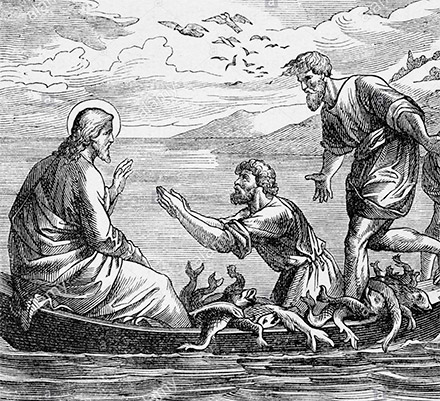 San Lucas relata que Jesús se subió un día a la barca de Pedro para predicar desde allí a la multitud y, al terminar, pidió a Pedro que llevara la barca mar adentro (es el Duc in altum!, ¡mar adentro!, que nos ha repetido Juan Pablo II como consigna para el tercer Milenio cristiano) y echara las redes para pescar. Pedro le respondió que habían estado toda la noche bregando y no habían pescado nada, pero añadió: «sin embargo porque tú lo dices echaré la red». Así lo hizo y quedó atónito, impresionado, al ver que casi no podían sacar la red del agua de tantos peces como habían cogido. Entonces se echó de rodillas a los pies de Jesús, con la cabeza inclinada hasta el suelo, y le dijo: «apártate de mí, Señor, que soy un hombre pecador» (Lc 5, 1-11).