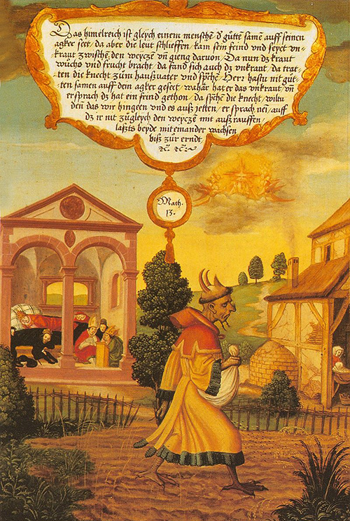 «Dejen que crezcan juntos hasta el tiempo de la cosecha y, cuando llegue la cosecha, diré a los segadores: Arranquen primero la cizaña y átenla en gavillas para quemarla; y luego almacenen el trigo en mi granero».