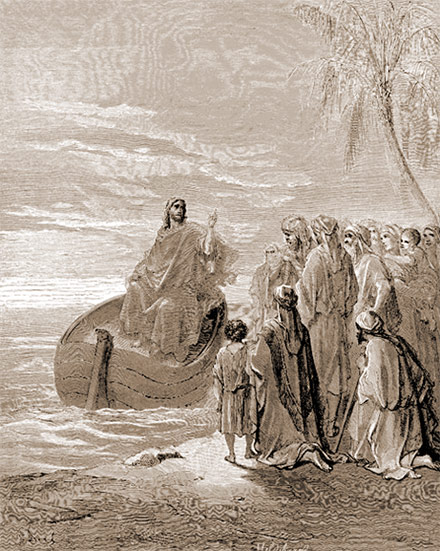 Después de la multiplicación de los panes, cuando Jesús dio de comer a cinco mil hombres, sus discípulos lo vieron caminando sobre el lago. Al día siguiente, la multitud, que estaba en la otra orilla del lago, se dio cuenta de que allí no había más que una sola barca y de que Jesús no se había embarcado con sus discípulos, sino que éstos habían partido solos. En eso llegaron otras barcas desde Tiberíades al lugar donde la multitud había comido el pan. Cuando la gente vio que ni Jesús ni sus discípulos estaban allí, se embarcaron y fueron a Cafarnaúm para buscar a Jesús.