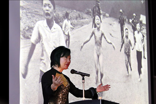 Vietnamese-Canadian Phan Thi Kim Phuc delivers her speech before her June 8, 1972 Pulitzer-Prize-winning photograph during the Vietnam war, during a lecture meeting in Nagoya, Aichi prefecture on April 13, 2013. Kim Phuc met with some 300 spectators in her first visit to Japan. AFP PHOTO / JIJI PRESS