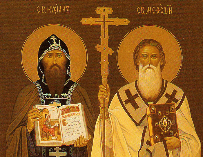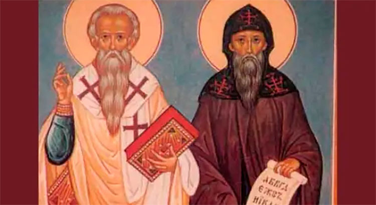 Martirologio Romano: Memoria de los santos Cirilo, monje, y Metodio, obispo, hermanos nacidos en Tesalónica, que fueron enviados a Moravia por el obispo Focio de Constantinopla para predicar la fe cristiana, y allí inventaron signos propios para traducir del griego a la lengua eslava los libros sagrados. En un viaje que hicieron a Roma, Cirilo, que antes se llamaba Constantino, enfermó y, habiendo profesado como monje, descansó en el Señor en este día († 869). Metodio, constituido obispo de Sirmium por el papa Adriano II, evangelizó toda la región de Panonia, y en todas las dificultades que tuvo que soportar fue siempre ayudado por los Pontífices Romanos, recibiendo finalmente el premio por sus trabajos en la ciudad de Velherad, en Moravia, el día 6 de abril († 885).