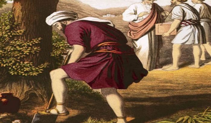 El primero negocia con los cinco talentos. Lo mismo hace el segundo, y ambos reciben un buen retorno en su inversión. El tercero cautelosamente entierra su talento. Cuando el dueño vuelve del viaje, alaba a los dos primeros y les da mayores responsabilidades, pero al tercero lo reprende.