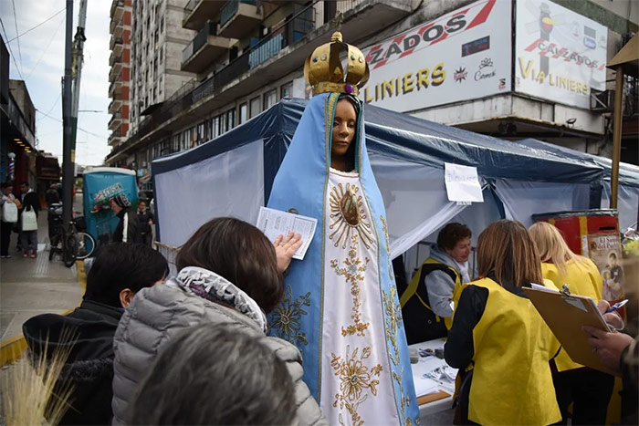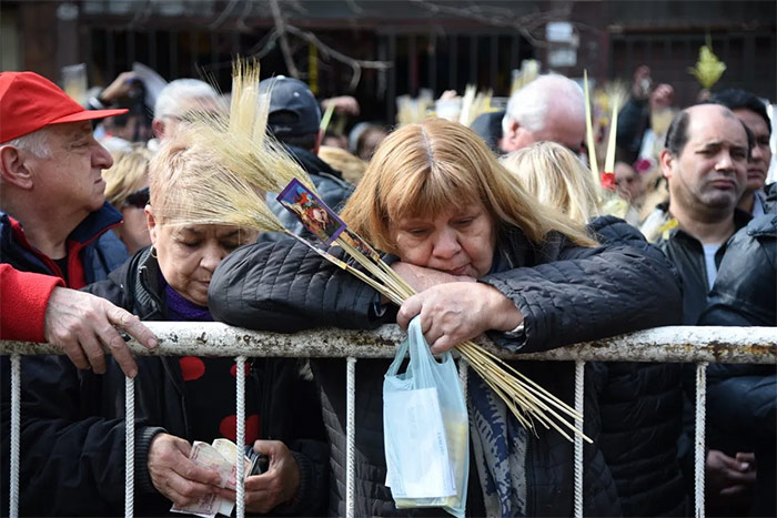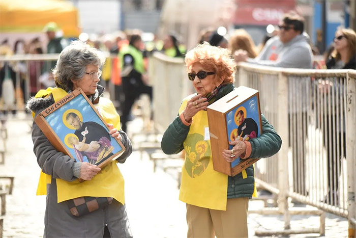 Segundos antes, un joven unos 40 años más joven que ella, unos cuarenta centímetros más alto que ella, con igual ternura aunque más discreto había tocado el pie de la imagen de San Cayetano. Detrás, decenas: jubilados, empleados administrativos, desempleados, religiosas, estudiantes, periodistas.