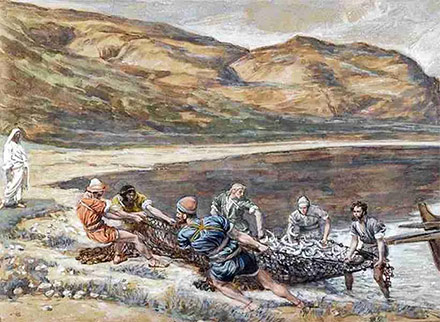 En la orilla (aunque no lo reconocen al principio) está el Señor Jesús. Siguiendo sus órdenes, bajan las redes y obtienen una pesca extraordinaria. Bueno, esta es la obra de la Iglesia hasta el fin de los tiempos: reunir almas y llevarlas a Cristo.