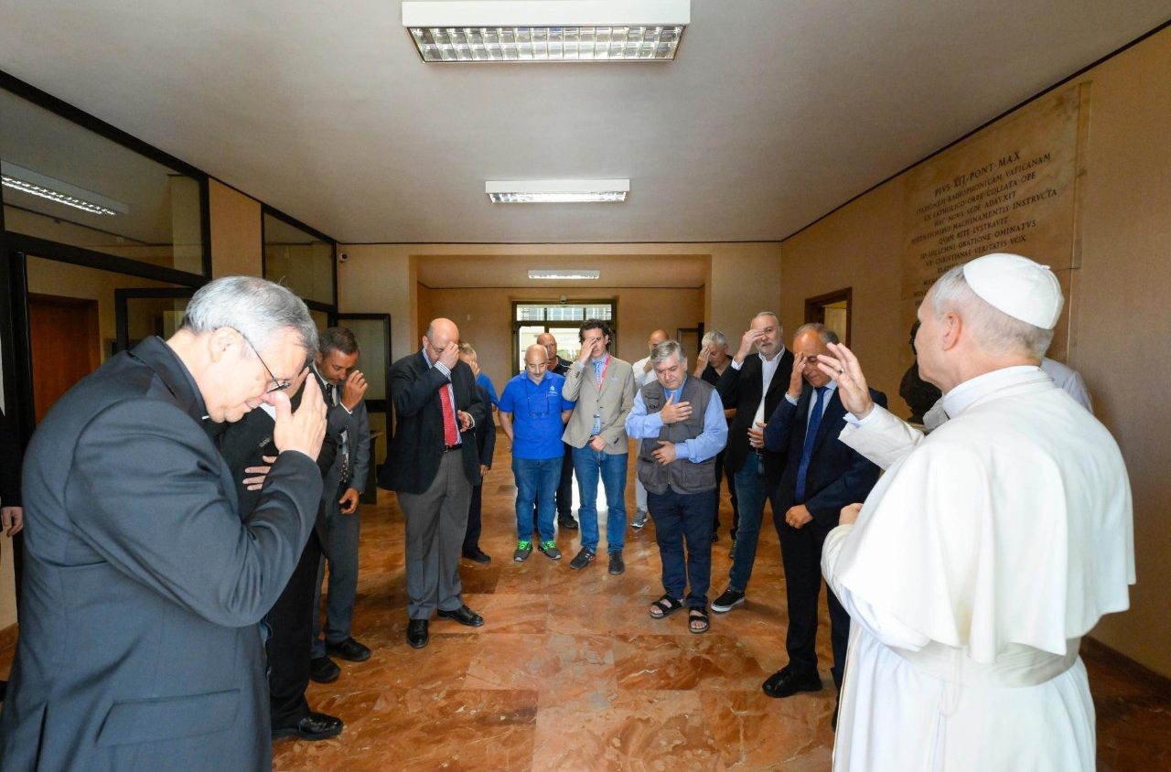 Se ha reunido con el personal del centro, con quienes conversó; también visitó la sala de transmisores diseñada por el arquitecto Pier Luigi Nervi y se sentó en la sala de control de las transmisiones en onda corta. El Papa se informó sobre el funcionamiento de las antenas, las transmisiones y el sistema de recuperación digital ante desastres, y celebró con el personal, con un pequeño tentempié, su 43° aniversario sacerdotal, que se conmemora hoy.