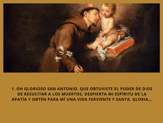 Oh san Antonio, el más clemente de todos los santos, tu amor por Dios y todas sus criaturas te valió poderes milagrosos en esta tierra. Te lo imploro, intercede en mi favor. Susurra mi ruego a la oreja del Niño Jesús, que tanto amaba acurrucarse entre tus brazos… (expresa tu petición)