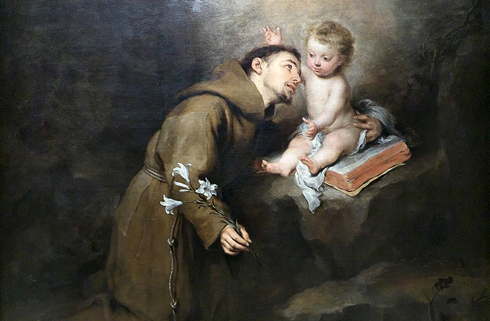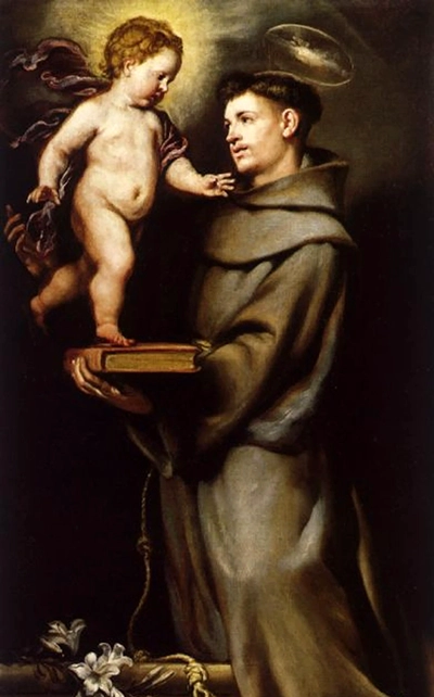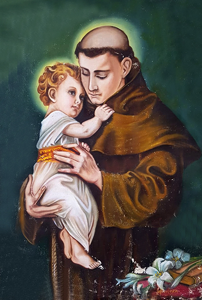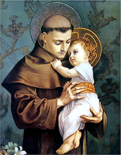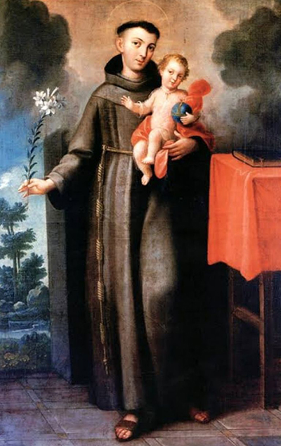 San Antonio nació en Portugal en 1195 y se le conoce con el apelativo de Padua porque en esa ciudad italiana fue donde murió (1231) y se veneran sus reliquias. Se dice que cierto día, mientras oraba, se le apareció el niño Jesús.
