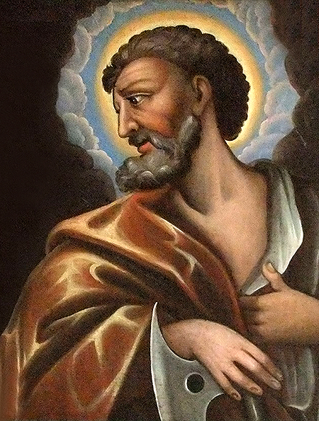 Una antigua tradición cuenta que murió crucificado. Lo pintan con una cruz de madera en su mano y los carpinteros le tienen especial devoción.
