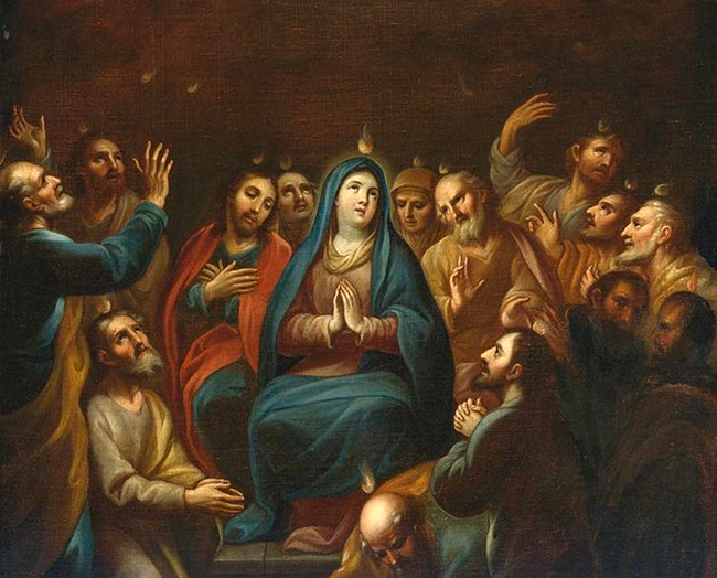 3. Durante esa oración en el Cenáculo, en actitud de profunda comunión con los Apóstoles, con algunas mujeres y con los hermanos de Jesús, la Madre del Señor invoca el don del Espíritu para sí misma y para la comunidad.