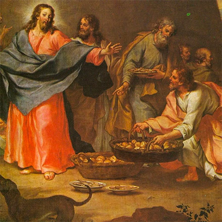 La gente hambrienta que se congrega alrededor de Jesús en esta escena es el símbolo de la raza humana hambrienta que, desde los tiempos de Adán y Eva, busca algo que la satisfaga. Hemos intentado llenar esa hambre con riqueza, placer, poder, honor, con el deseo de querer dominar — pero nada de esto funciona, precisamente porque todos hemos sido creados para Dios y Dios es sólo amor.