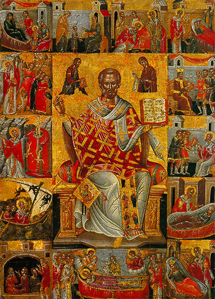 De San Nicolás, obispo de Mira (Licia) en el siglo IV, tenemos muchas noticias, pero es difícil distinguir las pocas auténticas del gran número de leyendas tejidas alrededor de este popularísimo santo, cuya imagen presentan todos los años los comerciantes vestido de «Papá Noel» (Nikolaus en Alemania y Santa Claus en los países anglosajones), un rubicundo anciano de barba larga y blanca, y con un costal lleno de regalos a la espalda.