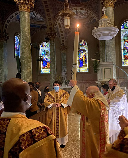En la noche, una llama vacilante. El sacerdote y la gente enciendieron sus velas. La luz se expandió. Las tinieblas retroceden. La procesión avanzó hacia el altar. La iglesia se llenó de resplandor. La Iglesia celebra la Pascua.