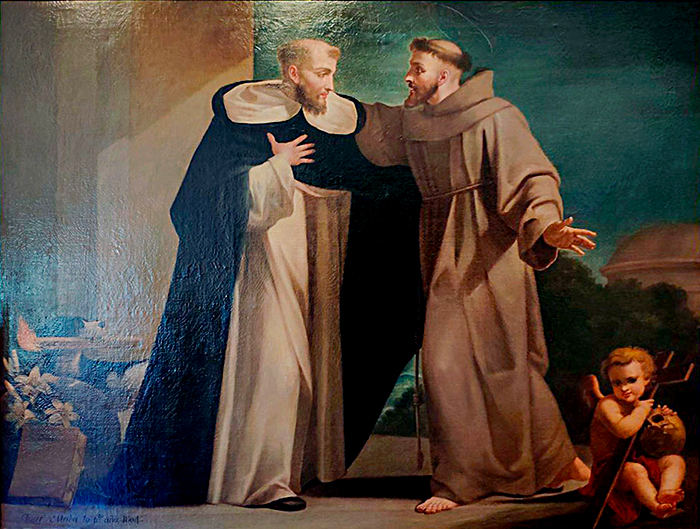 Y cuentan las antiguas tradiciones que Santo Domingo vio en sueños que la ira de Dios iba a enviar castigos sobre el mundo, pero que la Virgen Santísima señalaba a dos hombres que con sus obras iban a interceder ante Dios y lo calmaban. El uno era Domingo y el otro era un desconocido, vestido casi como un pordiosero. Y al día siguiente estando orando en el templo vio llegar al que vestía como un mendigo, y era nada menos que San Francisco de Asís. Nuestro santo lo abrazó y le dijo: «Los dos tenemos que trabajar muy unidos, para conseguir el Reino de Dios». Y desde hace siglos ha existido la bella costumbre de que cada año, el día de la fiesta de San Francisco, los Padres dominicos van a los conventos de los franciscanos y celebran con ellos muy fraternalmente la fiesta, y el día de la fiesta de Santo Domingo, los padres franciscanos van a los conventos de los dominicos y hacen juntos una alegre celebración de buenos hermanos.