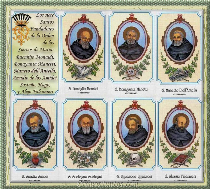 Según la tradición hubo siete hombres, muy respetables y honorables, a los que nuestra Señora unió, a manera de siete estrellas, para iniciar la Orden suya y de sus siervos. Los siete nacieron en Florencia; primero llevaron una vida eremítica en el monte Senario, dedicados en especial a la veneración de la Virgen María. Después predicaron por toda la región toscana y fundaron la Orden de los Siervos de Santa María Virgen, aprobada por la Santa Sede en 1304. Se celebra hoy su memoria, porque en este día, según se dice, murió San Alejo Falconieri, uno de los siete, el año 1310.
