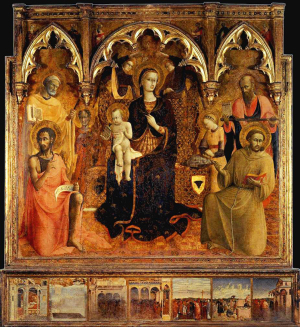 A los lados, el artista Stefano di Giovanni puso a los santos Pedro y Pablo (de pie) y los santos Juan Bautista y Francisco. En el caso de este último se trata de un tributo a la cliente, quien entró en la orden franciscana tras la muerte de su marido.