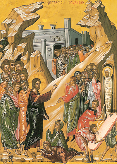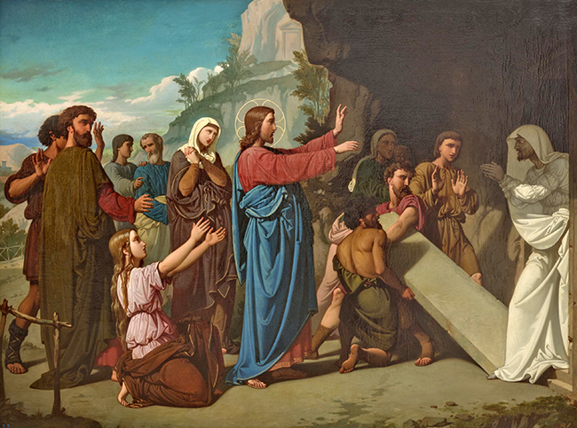 Y fue al sepulcro que era una cueva con una piedra en la entrada. Dijo Jesús: «Quiten la piedra». Le responde Marta: «Señor ya huele mal porque hace cuatro días que está enterrado». Le dice Jesús: «¿No te he dicho que si crees verás la gloria de Dios?». Quitaron la piedra y Jesús dijo en voz alta: «Lázaro ven afuera». Y el muerto salió, llevando el sudario y las vendas de sus manos.