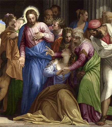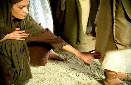 Jesús se levantó y lo siguió, acompañado de sus discípulos. Entonces, una mujer que padecía flujo de sangre desde hacía doce años, se le acercó por detrás y le tocó la orilla del manto, pues pensaba: «Con sólo tocar su manto, me curaré». Jesús, volviéndose, la miró y le dijo: «Hija, ten confianza; tu fe te ha curado». Y en aquel mismo instante quedó curada la mujer.