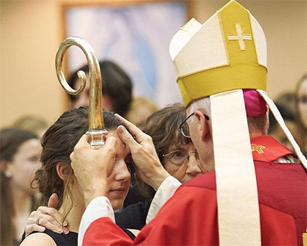 El Espíritu Santo ha dado a todos los pueblos el conocimiento de Dios, pero esto sólo lo hace a través de cada uno de nosotros. En un momento intrascendente de la nuestra, uno de vosotros, después de una pregunta, que no recuerdo, dijo: “a mí no me mires”. Yo puedo no mirar. Nosotros podemos no mirar pero nunca le diga a Dios: “a mí no me mires”, porque Él no puede dejar de mirar. El Espíritu Santo es la mirada de Dios sobre cada uno de nosotros. Una mirada que comienza en el primer momento de nuestra existencia, que después se define de forma cristiana en nuestro bautismo y que hoy se confirma. La confirmación es sencillamente eso que dice su nombre, confirmar algo que ya existe: ser de Cristo por el don del Espíritu Santo. Hacerlo a esa edad vuestra, para ustedes que fue bautizado de pequeños, debe tener el sentido de vivir e interiorizar qué significa ser cristianos. Alguno de vosotros colocaba su fe dentro de una relación personal con Dios, con Jesucristo y con la Virgen. María, como representa bien esta pintura del presbiterio, la penúltima en toda la vida de la Virgen que tenemos representada en esta basílica, es la que preside los apóstoles en Pentecostés. ¡Es bueno que esté presente en nuestro Pentecostés! En Montserrat somos constantemente testigos.