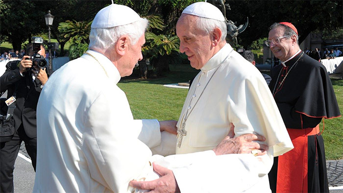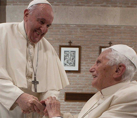 A finales de 2013, el Papa Francisco y su predecesor se encontraron dos veces en diciembre: el 23 del mes, el Papa Bergoglio fue al Monasterio “Mater Ecclesiae”, para presentar sus saludos navideños a Benedicto XVI, mientras que cuatro días después, el 27 de diciembre, el Papa emérito se desplaza a Casa Santa Marta para almorzar con el Pontífice, por invitación suya.