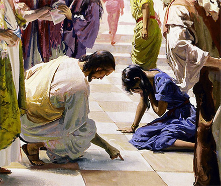 Ahora, ¿qué hace Jesús ante esta turba violenta? Primero, se pone a escribir en el suelo. Esta escritura misteriosa podría indicar una lista de los pecados de cada una de las personas en el grupo. Como se dice en otro Evangelio, “Quita primero la viga de tu propio ojo, y luego podrás ver más claramente la paja en el ojo de tu hermano”.