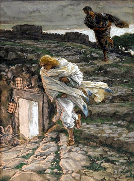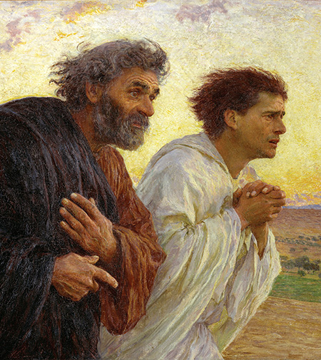 Salieron Pedro y el otro discípulo camino del sepulcro. Los dos iban corriendo juntos, pero el otro discípulo corrió más aprisa que Pedro y llegó primero al sepulcro, e inclinándose, miró los lienzos puestos en el suelo, pero no entró.