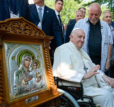 Al final, al saludarles, les regaló un icono de la Virgen «Santísima Señora de Jerusalén». De fabricación religiosa moderna, este icono de la Theotokos (Madre de Dios) es muy popular entre los peregrinos de Tierra Santa porque el original está colocado en un venerado altar dentro de la iglesia de la Asunción de María, que se celebra litúrgicamente el 15 de agosto.