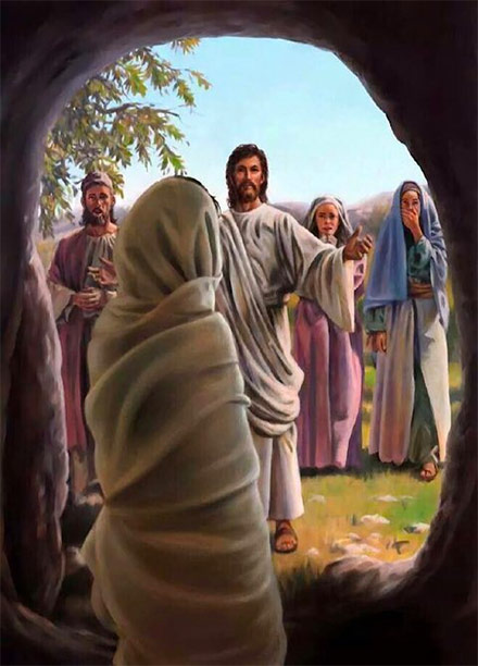 Y fue al sepulcro que era una cueva con una piedra en la entrada. Dijo Jesús: «Quiten la piedra». Le responde Marta: «Señor ya huele mal porque hace cuatro días que está enterrado». Le dice Jesús: «¿No te he dicho que si crees verás la gloria de Dios?». Quitaron la piedra y Jesús dijo en voz alta: «Lázaro ven afuera». Y el muerto salió, llevando el sudario y las vendas de sus manos.