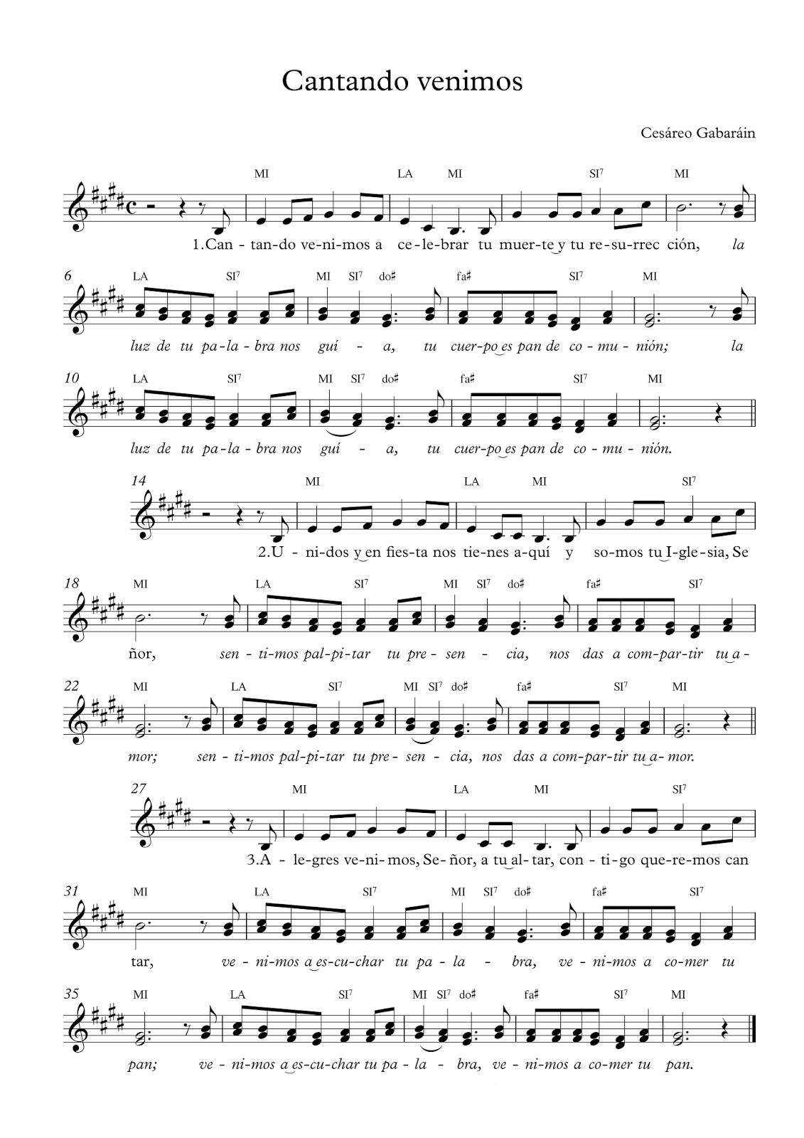 Quiero recomendarte en esta ocasión, el canto “Cantando venimos” de Cesáreo Gabaráin, sacerdote y compositor español, autor de innumerables cantos litúrgicos que forman parte de nuestro repertorio usual de misa. A continuación les comparto el texto con cifrado y también la partitura para quienes leen música y que por cierto es muy recomendable cultivar.