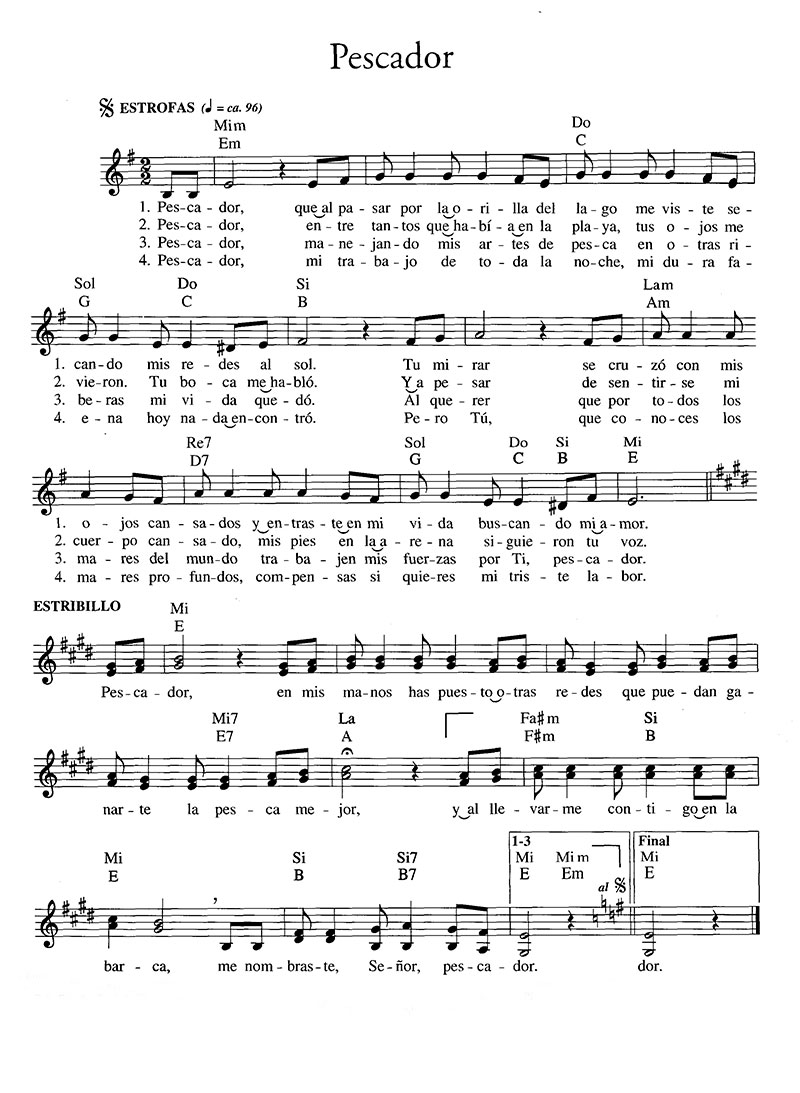 Esta vez te comparto la canción: El Pescador con letra y música de Emilio Vicente Matéu, Autor de obras como: «Cantamos nuestra Fe», «Un pueblo que camina», «Madre del pueblo», «Vendrá la libertad», «Sacramentos», «Creemos en el amor» y «Jesucristo es Señor». Actualmente es catedrático en la especialidad de Música y ha dirigido durante muchos años centros docentes privados y públicos. Ejerce como Inspector Educativo de la Comunidad Autónoma de Canarias.
