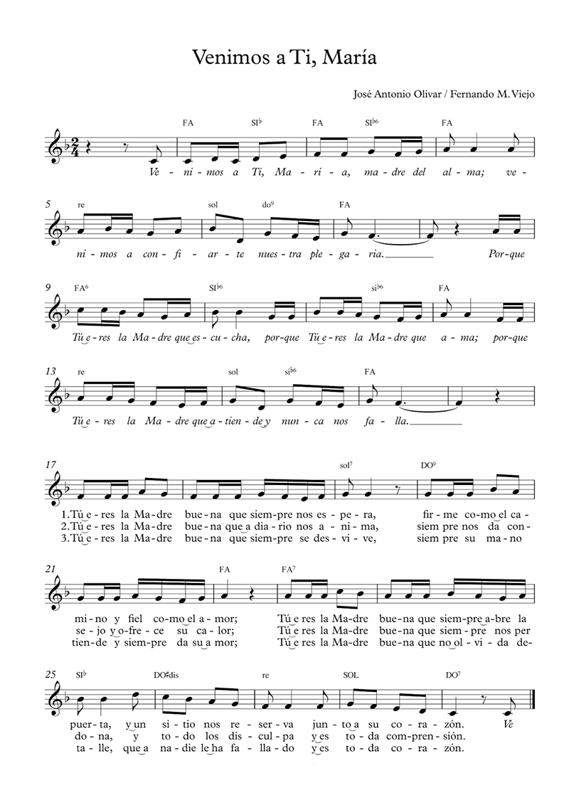 Hoy 24 de mayo, día María Auxiliadora , queremos compartir con ustedes uno de los cantos más bonitos del repertorio popular católico: Venimos a ti María, firmada por José Antonio Olivar y Fernando M. Viejo, un bello homenaje en este día de especialísima celebración mariana.