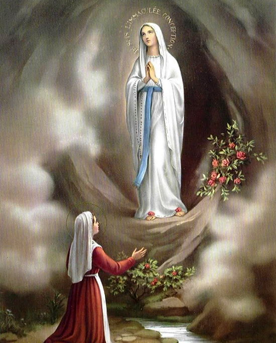 Pues no habían pasado aún cuatro años cuando cerca de un pueblo de Francia, en las estribaciones de los Pirineos, la Santísima Virgen, vestida de blanco, cubierta con cándido manto y ceñida su cintura de faja azul, se apareció con aspecto juvenil y afable en la cueva de Massabielle a una niña inocente y sencilla, a la que, como insistiera en saber el nombre de quien se le había dignado aparecer, ella, con una suave sonrisa y alzando los ojos al cielo, respondió: «Yo soy la Inmaculada Concepción».