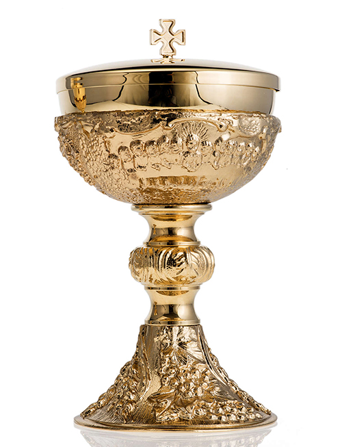 Recipiente metálico con tapa en forma de copa, en el que se conservan las hostias que serán consagradas para posteriormente distribuirlas en la comunión y también para ser llevadas a los enfermos.