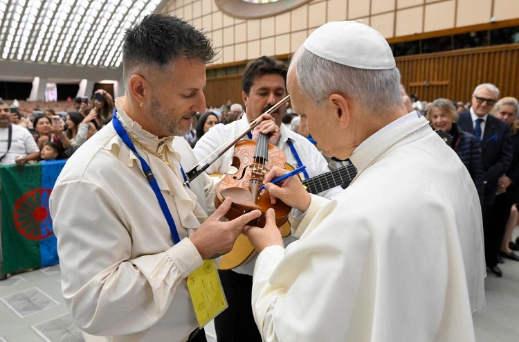 La llegada del Papa, a las 11h20, viene precedida de momentos de música balcánica y jazz manouche. Violines, guitarras, clarinetes, trompetas y tambores resuenan por las bóvedas de la antigua Aula Nervi, donde se comparten testimonios y experiencias desde el escenario. Y se leen escritos de gitanos del presente y del pasado. Conmovedor el que recuerda la tragedia del exterminio de los gitanos en Auschwitz: «Pueden matarnos, pero como las flores, siempre volvemos», escribió un superviviente. Aplausos en la sala, luego el Cardenal Fabio Baggio, Subsecretario del Dicasterio para el Servicio del Desarrollo Humano Integral -el Dicasterio promotor y organizador del Jubileo, junto con la Fundación Migrantes- pide «un momento de silencio y recogimiento» y pide a todos que recen el Padre Nuestro en su propia lengua. Se leen pasajes del Evangelio y de nuevo se reanuda la música y el baile con un grupo de niños y adolescentes.
