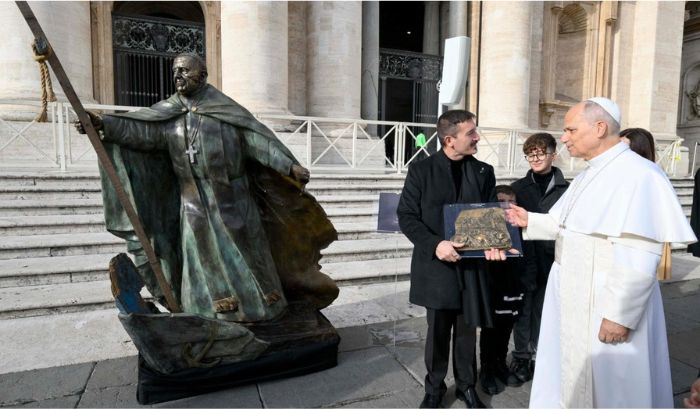 Una escultura de bronce que representa al Papa Francisco fue donada al Pontífice por el escultor Domenico Sepe, quien quiso encapsular en la obra el compromiso de Bergoglio con los migrantes. “En la estatua se incluyen algunos fragmentos del barco naufragado en Cutro en 2023, mientras que una cruz y un ancla simbolizan el sacrificio y la esperanza. Además, el Papa está representado con un manto que recuerda el hábito de San Francisco y se apoya sobre dos piedras que recuerdan la importancia del ministerio petrino”.