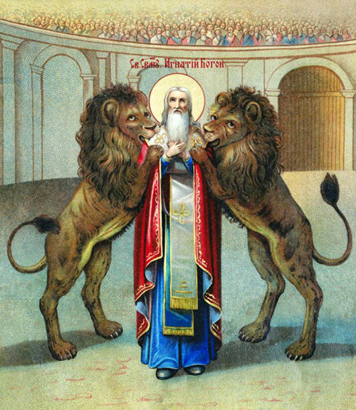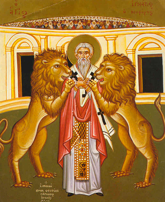 Según Ireneo y Orígenes, San Ignacio fue arrojado a las fieras en lugar de los «gladiadores para los juegos públicos» en el Coliseo de Roma hacia el año 110. Los restos del mártir, fueron llevados a Antioquia donde para ser venerados, al principio de un modo que no llamara la atención «en un cementerio fuera de la puerta de Dafnis».