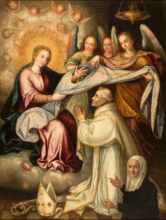 La noche del 18 de diciembre del 665 San Ildefonso junto con sus clérigos y algunos otros, fueron a la iglesia, para cantar himnos en honor a la Virgen María. Encontraron la capilla brillando con una luz tan deslumbrante, que sintieron temor. Todos huyeron excepto Ildefonso y sus dos diáconos. Estos entraron y se acercaron al altar. Ante ellos se encontraba la Virgen María, sentada en la silla del obispo, rodeada por una compañía de vírgenes entonando cantos celestiales. María al ir hizo una seña con la cabeza para que se acercara. Habiendo obedecido, ella fijó sus ojos sobre él y dijo: «Tu eres mi capellán y fiel notario. Recibe esta casulla la cual mi Hijo te envía de su tesorería.» Habiendo dicho esto, la Virgen misma lo invistió, dándole las instrucciones de usarla solamente en los días festivos designados en su honor.