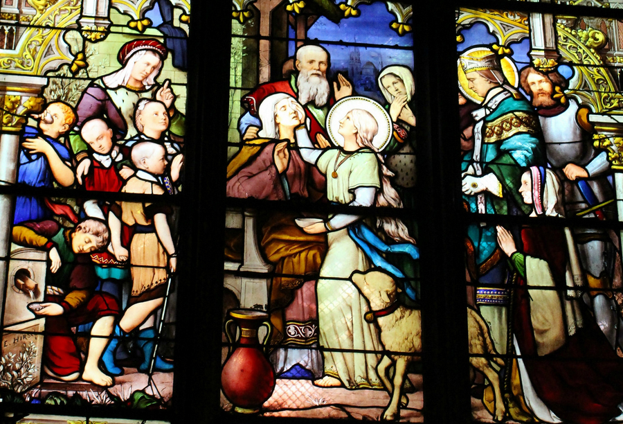 En dos de los relatos se funda el patronazgo sobre París. Uno fue la liberación del ataque esperado y temido de Atila invasor; el otro fue la milagrosa provisión de alimentos que la santa proporciona a los sitiados parisinos ante el asedio que la isla del Sena soporta por parte del rey Clovis en lucha por su corona, cuando ya se comenzaba a diezmar la ciudad por el hambre. Y a fuer de verdad, no es extraño que los parisinos la tengan por patrona.