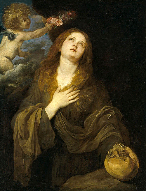 La iconografía la presenta como ermitaña o bien revestida con hábito agustino. Sus principales atributos son: una corona de rosas, en alusión a su nombre; y un crucifico y una calavera, por su ascesis.